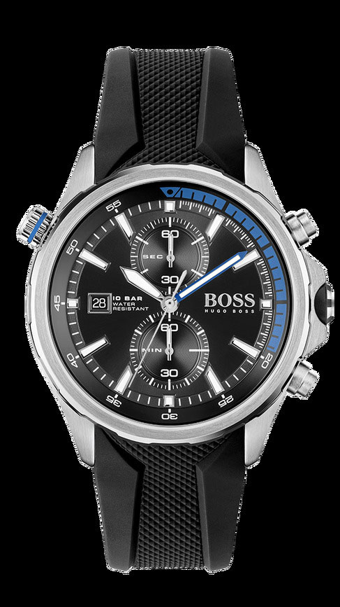 Ανδρικό ρολόι Hugo Boss από ανοξείδωτο ατσάλι με μαύρο καντράν και ασημί δείκτες και σημεία, καθώς και λουράκι καουτσούκ.