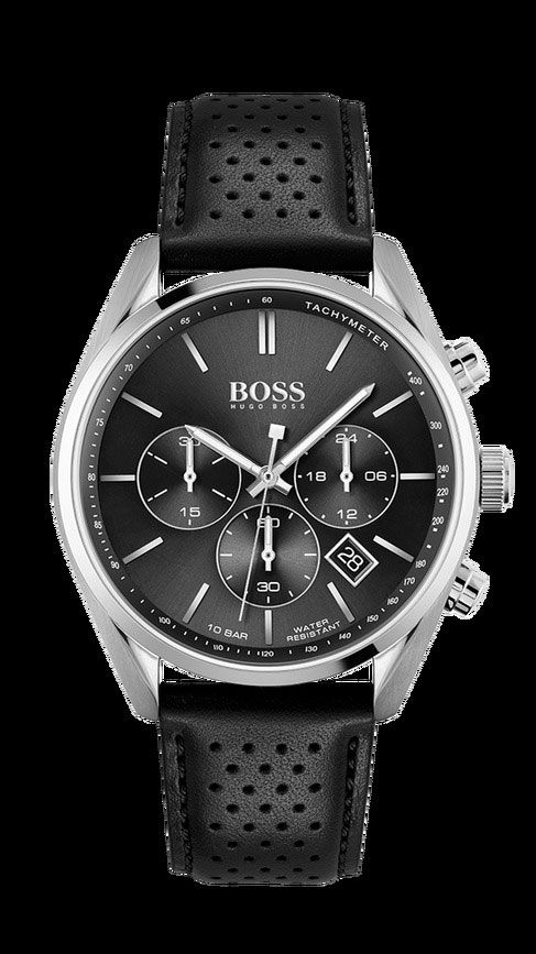 Men’s watch Hugo Boss made of stainless steel with black dial and black leather strap.