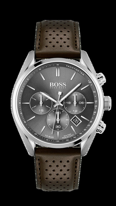 Men’s watch Hugo Boss made of stainless steel with gray dial and brown leather strap.