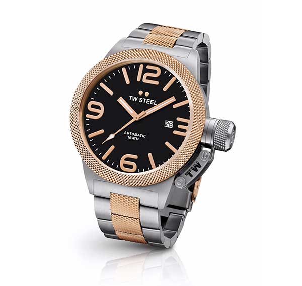 Men’s watch by TW Steel, from the Canteen Bracelet collection, chronograph with black dial, rose-gold stainless steel case and silver metal bracelet with rose-gold details