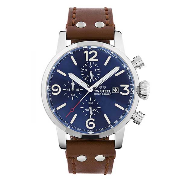 Men’s watch by TW Steel from the Maverick collection, with blue dial, silver stainless steel case and brown leather strap