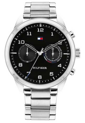Men’s Tommy Hilfiger watch made of stainless steel in silver color, black dial and bracelet, made of stainless steel in silver color